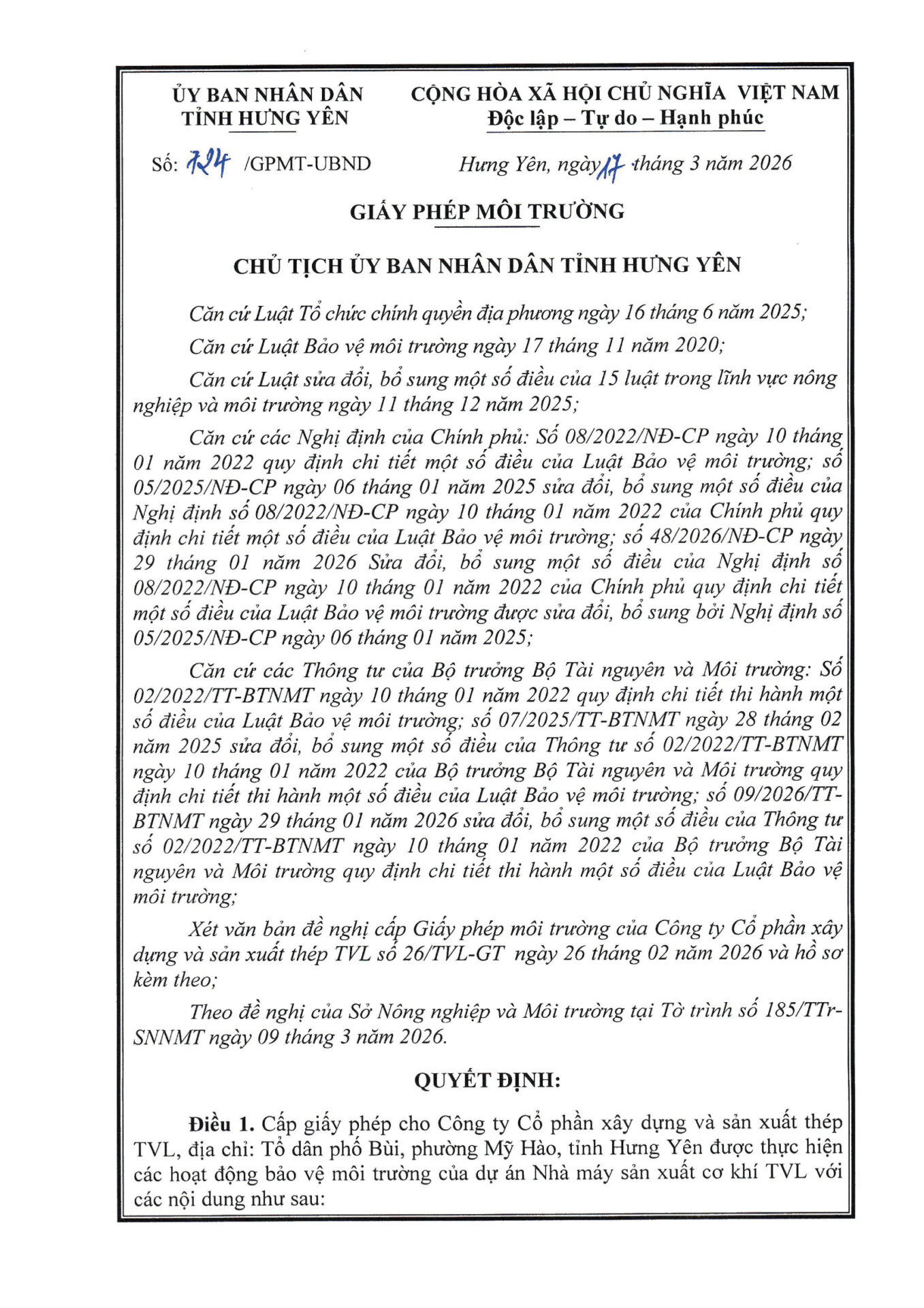 Căn cứ Luật Bảo vệ môi trường năm 2020 và các văn bản hướng dẫn thi hành, Ủy ban Nhân dân tỉnh Hưng Yên đã xem xét và ban hành 724-QĐ GIẤY PHÉP MÔI TRƯỜNG cho Công ty Cổ phần Xây dựng & Sản xuất Thép TVL theo đúng trình tự, thủ tục quy định.